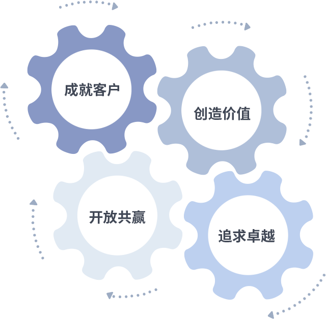 成就客户是一切决策的出发点,创造价值是衡量所有工作的标准,追求卓越是腾博会做事做人的态度,开放共赢是腾博会的格局也是最终的结果。价值观的齿轮环环相扣,推动着组织里的每个人不断向前。